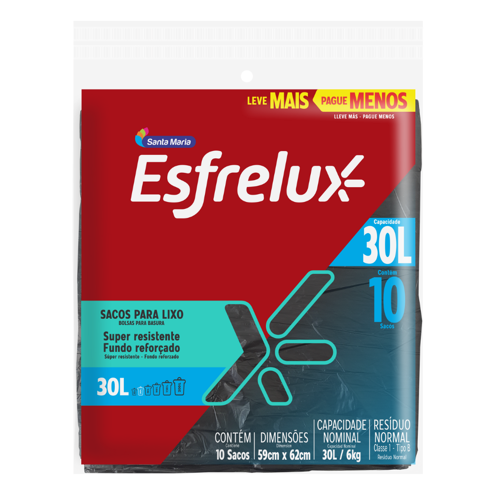 Saco Para Lixo Esfrelux Com 30 Litros Em Almofada Com 10 Unidades Santa Maria. Excelente desempenho e resistência. Maior segurança nas tarefas. Na cor preta. Não tem cheiro. Uso exclusivo para lixo. Oferece descrição no conteúdo do lixo. Na versão almofada.
